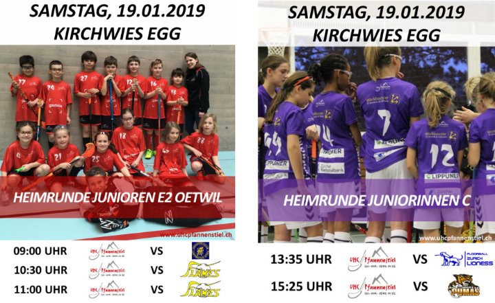 Am Wochenende startet der UHC Pfannenstiel wieder mit vollem Programm zu Hause ins Jahr 2019. Am Samstag werden die beiden Junioren E-Teams aus Egg und Esslingen ihre Heimrunde bestreiten. Die E-Junioren Egg spielen um 09:00 Uhr gegen die Glattal Falcons, um 10:30 gegen die Kloten-Dietlikon Jets und um 11:00 gegen die ZO Pumas. Die E-Junioren Esslingen ihrerseits duellieren sich um 09:00 Uhr mit den ZO Pumas, ehe sie 10:30 den Jona-Uznach Flames gegenüberstehen und um 11:00 auf den UHC Eschenbach treffen.